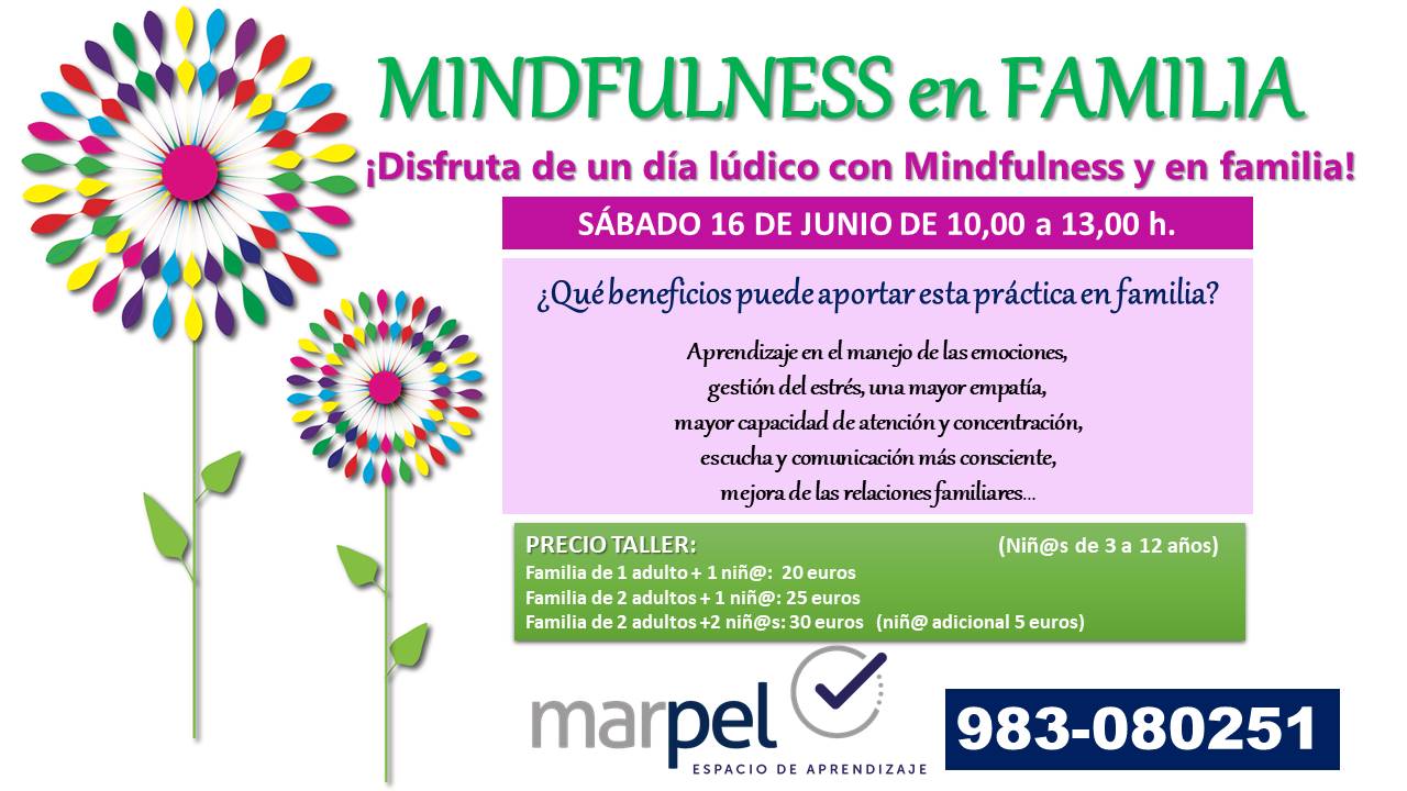 TALLER MINDFULNESS EN FAMILIA 16 DE JUNIO Públicado en 8 junio, 2018 por Centro de Estudios MARPEL RESERVA DE PLAZAS EN EL 983-080251 O EN NUESTRO CENTRO DE ARROYO DE LA ENCOMIENDA, EN LA CALLE HERNANDO DE SOTO, 8-10 (JUNTO AL COLEGIO ATENEA).