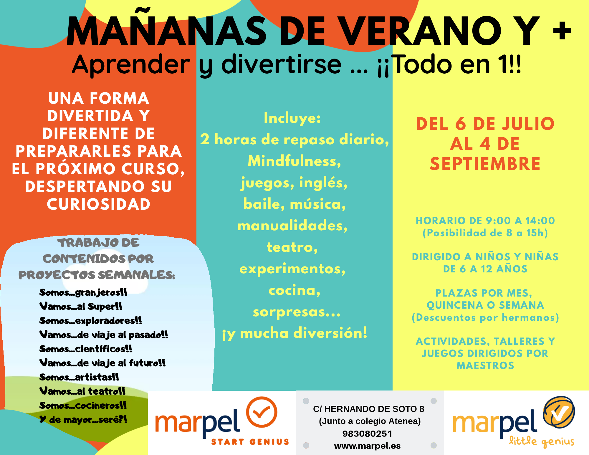Campamento de mañanas dirigido a niños de 6 a 12 años, en el que tendrán 2 horas de clases de refuerzo en las que repasarán los contenidos del tercer trimestre y avanzaremos para empezar bien el nuevo curso!!, además se realizarán talleres diarios, experimentos, manualidades, juegos,… todos orientados a despertar su curiosidad y ganas de aprender, siempre bajo un protocolo de seguridad frente al COVID-19 (toma de temperatura diaria, desinfección con máquina de ozono, limpieza de manos, uso obligatorio de mascarilla, ….)