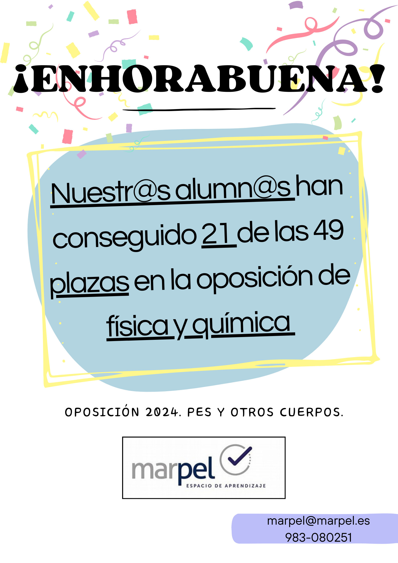 Un año más nuestr@s alumn@s triunfan en las oposiciones a FÍSICA Y QUÍMICA👏👏👏👏 Públicado en 1 agosto, 20241 agosto, 2024 por Centro de Estudios MARPEL
