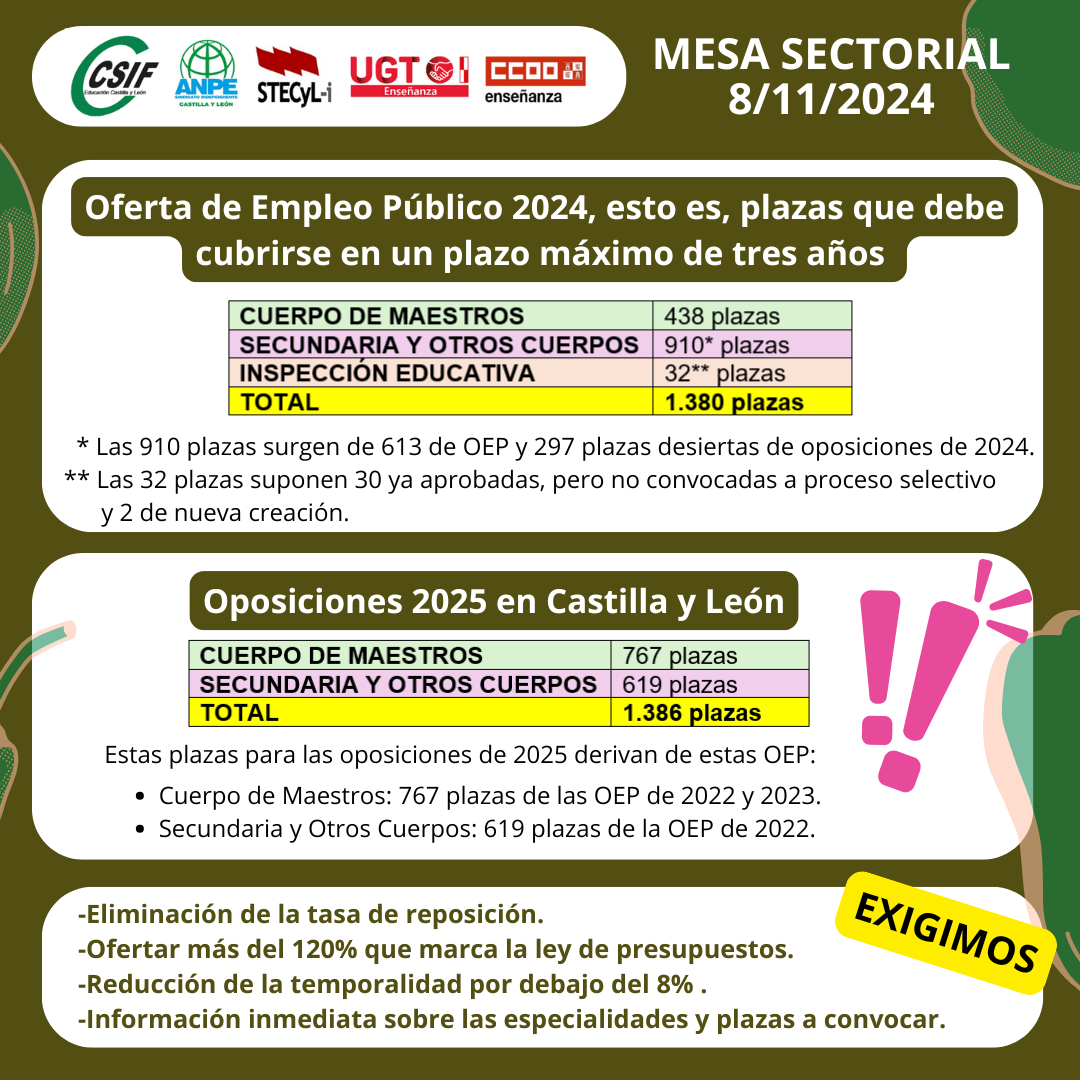 Por fin tenemos noticias de Castilla y León, en la mesa sectorial que se ha celebrado esta mañana, se ha acordado que este año 2025 HABRÁ OPOSICIONES AL CUERPO DE MAESTROS, PERO TAMBIÉN DE SECUNDARIA Y PROFESORES TECNICOS, en total se esperan 1.386 plazas.